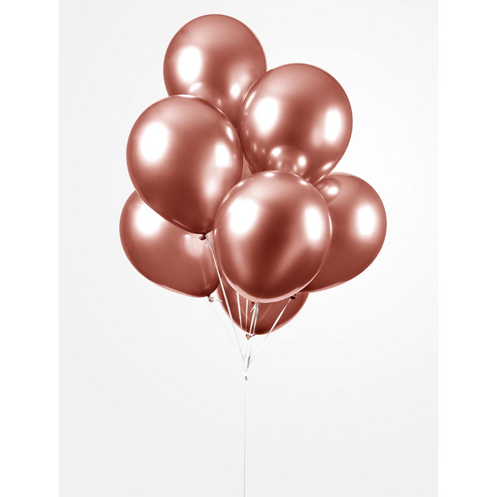 بالونات لاتكس كروم نحاسية تحتوي على 100 بالون نحاسي اللون، مصنوعة من مطاط لاتكس طبيعي بتأثير مرآة كرومية. يمكن تعبئة البالونات بالهواء أو الهيليوم، وتتسع لحوالي 15 لترًا.