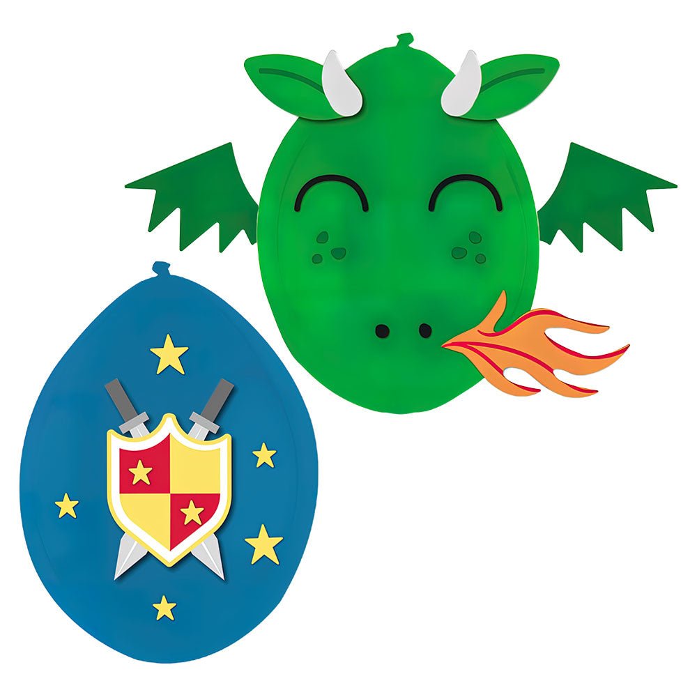 3D Latex Balloons Set Knight includes a set of blue and green balloons along with paper decorations and stickers in the form of a coat of arms and a fire-breathing dragon. Inflate the balloons and decorate them with the stickers and paper decorations. The paper decorations are attached with the included adhesive tabs.