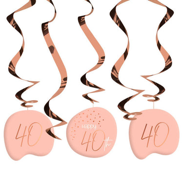 Happy 40th Hanging Decorations Light Pink includes 5 rose gold swirls, three of which have light pink hanging decorations with "Happy 40th" text in white and rose gold. The swirls also have practical plastic hanging loops.