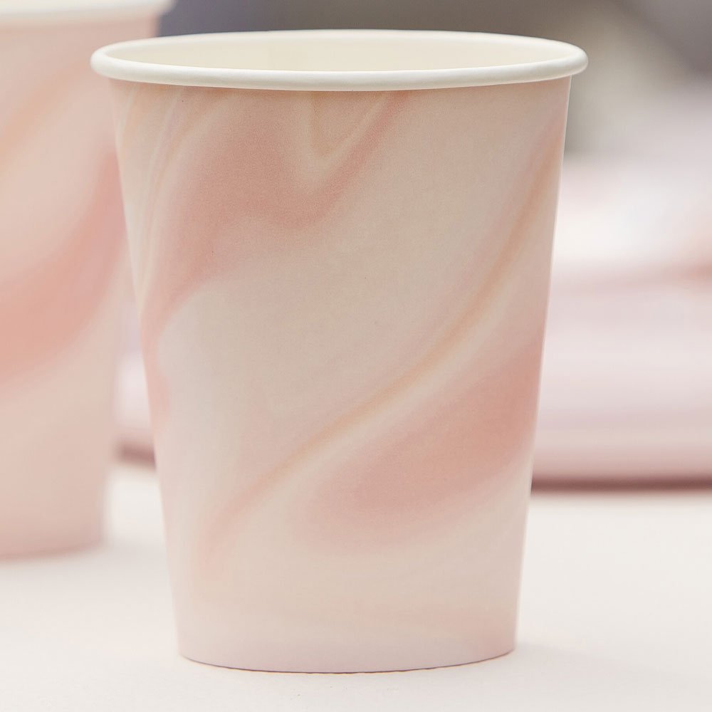Pink Party Paper Cups include pink disposable paper cups with a decorative marble pattern. The cups come in a pack of 8 and hold approximately 266 ml. The disposable cups are also recyclable.