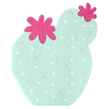 Cactus Napkins include three-layer napkins in the shape of mint green cacti with round shapes and pink flowers and dots in white and gold. Sold in packs of 20.