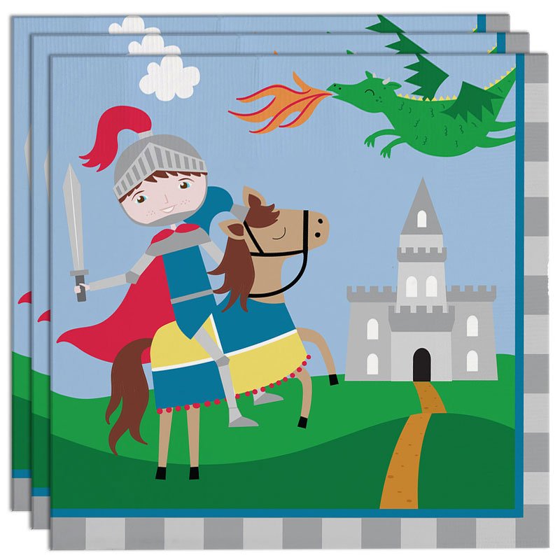 Knight Napkins include a 20-pack of paper napkins with a colorful design of a knight and a horse with a large castle and a fire-breathing dragon in the background. The napkins are two-ply and measure 33 x 33 cm unfolded.