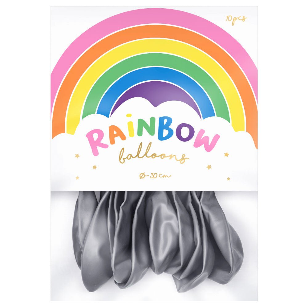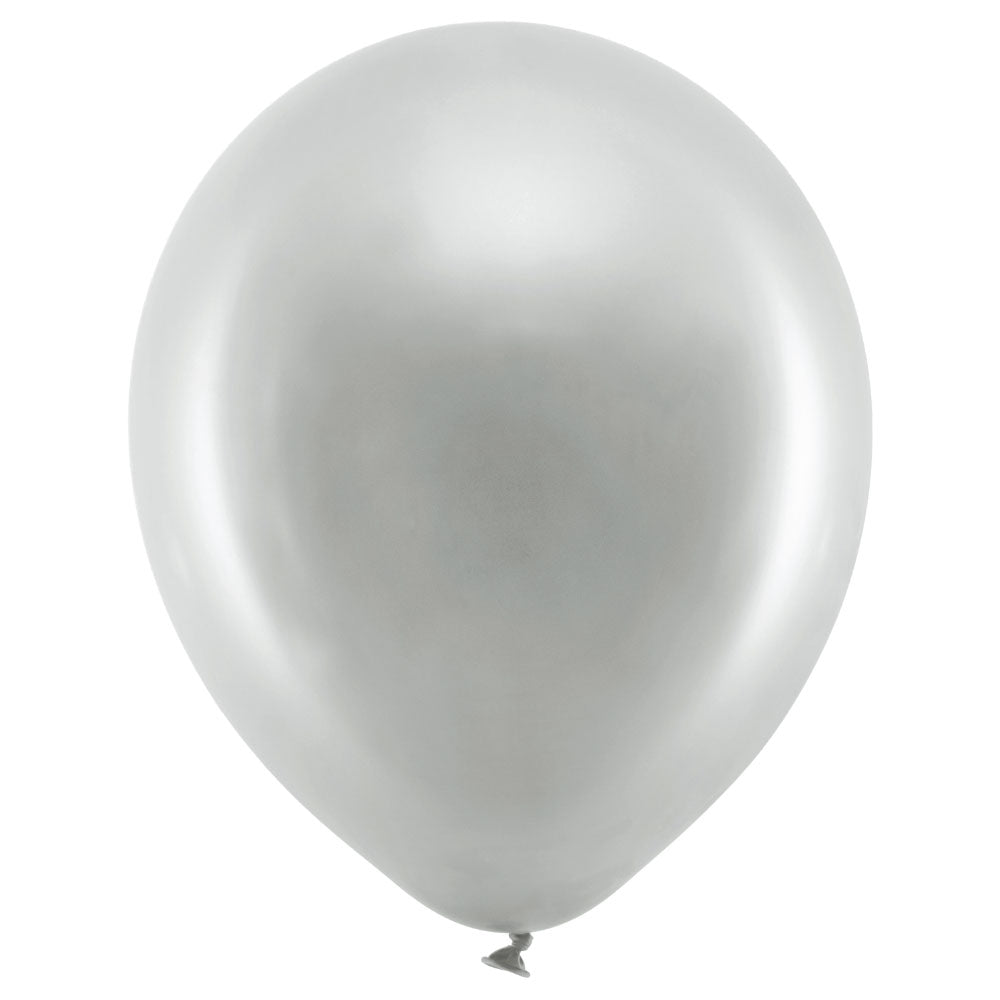 Rainbow Latex Balloons Metallic Silver includes 10 metallic latex balloons in silver. The balloons can be filled with air or helium and measure approximately 30 cm in diameter.
