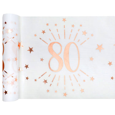 80 Years Birthday Party Rose Gold Table Runner includes a white disposable table runner with a rose gold 80th birthday motif. The cloth is made of non-woven polyester and is approximately 30 cm wide and 5 meters long.