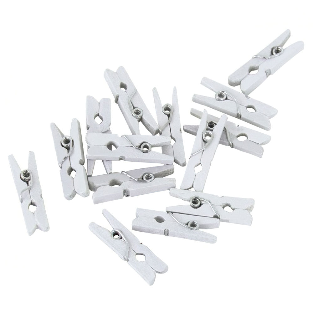 Mini Clothespins White includes a 24-pack of white mini clothespins made of wood, each about 2.5 cm long.