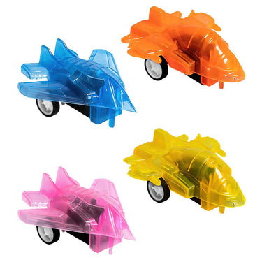Pull Back Airplane Set includes small toys in the shape of airplanes with wheels and pull-back function. When you pull the airplane back and then release, it quickly moves forward again. The airplanes are transparent in different colors. Comes in a pack of 4 airplanes.