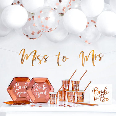 Organize an unforgettable bachelorette party for the bride-to-be with the help of this bachelorette party kit! A truly festive party package with bachelorette accessories and decorations in elegant rose gold that makes it super easy to create a memorable bachelorette party. The package includes a festive "Miss to Mrs" banner, shimmering confetti, and accessories for a festive bachelorette table setting. The perfect party kit for anyone who wants to create a truly beautiful bachelorette party in shimmering rose gold.