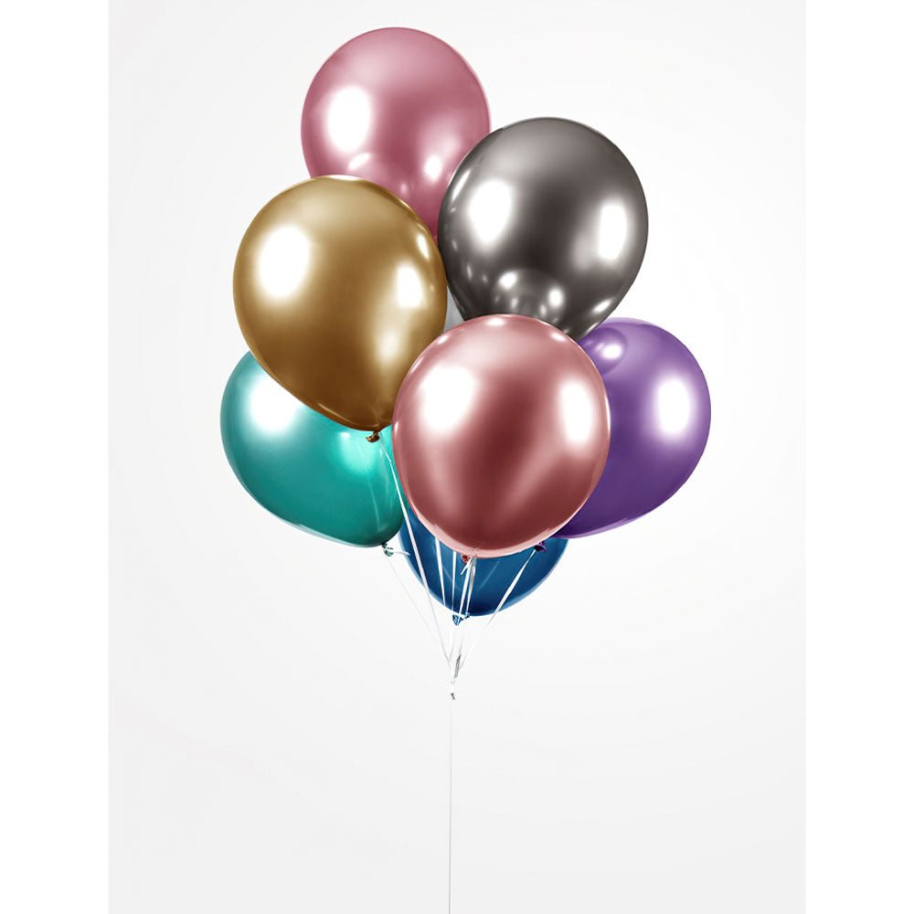 Latex Balloons Chrome Color Mix includes 100 balloons in natural rubber latex with a chrome mirror effect in various colors. Fill the balloons with air or helium. Each holds about 15 liters.