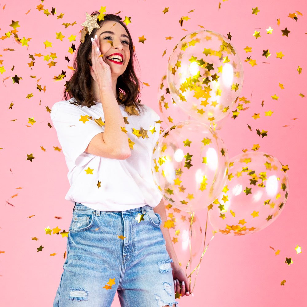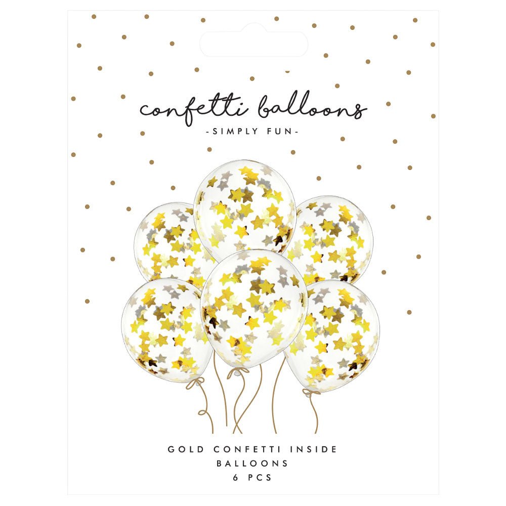 Confetti Balloons Stars Gold includes a 6-pack of transparent latex balloons with star-shaped gold confetti inside. The balloons can be filled with air or helium and become about 30 cm in size.