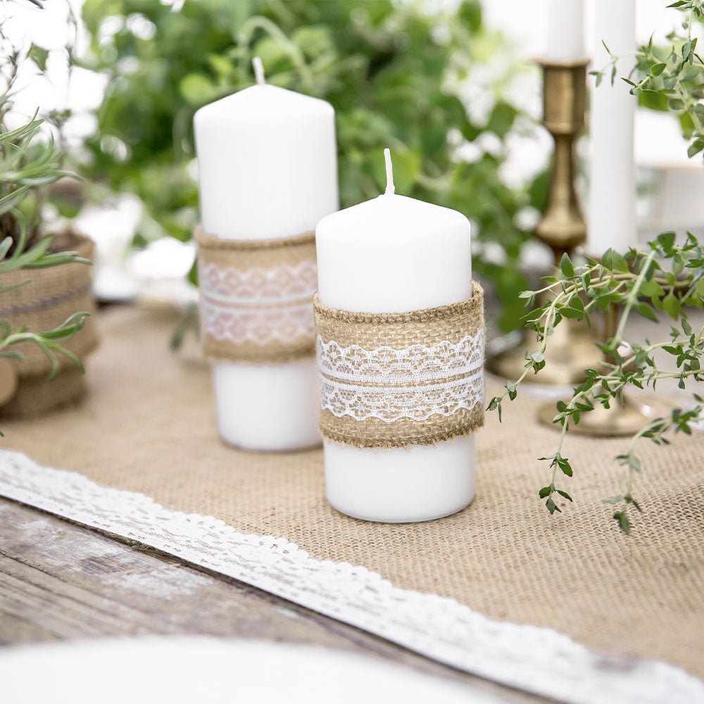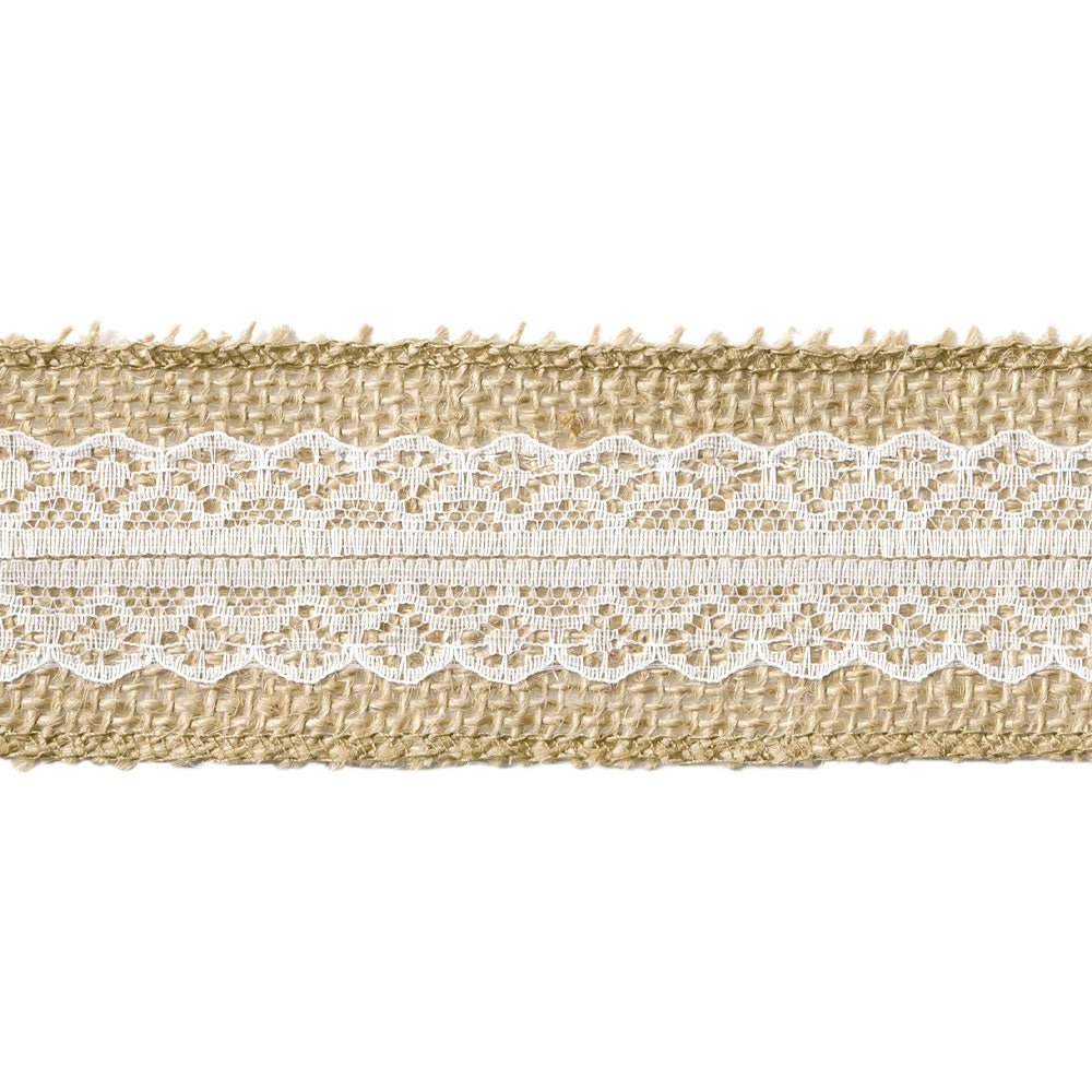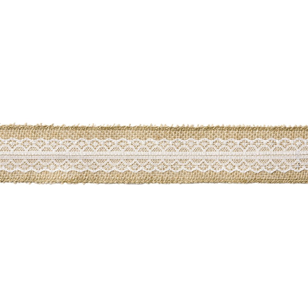Decorative Ribbon with Lace Jute includes a natural-colored jute decorative ribbon with decorative white lace. The ribbon comes on a convenient roll and is approximately 5 cm wide and 5 meters long.