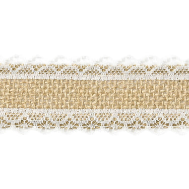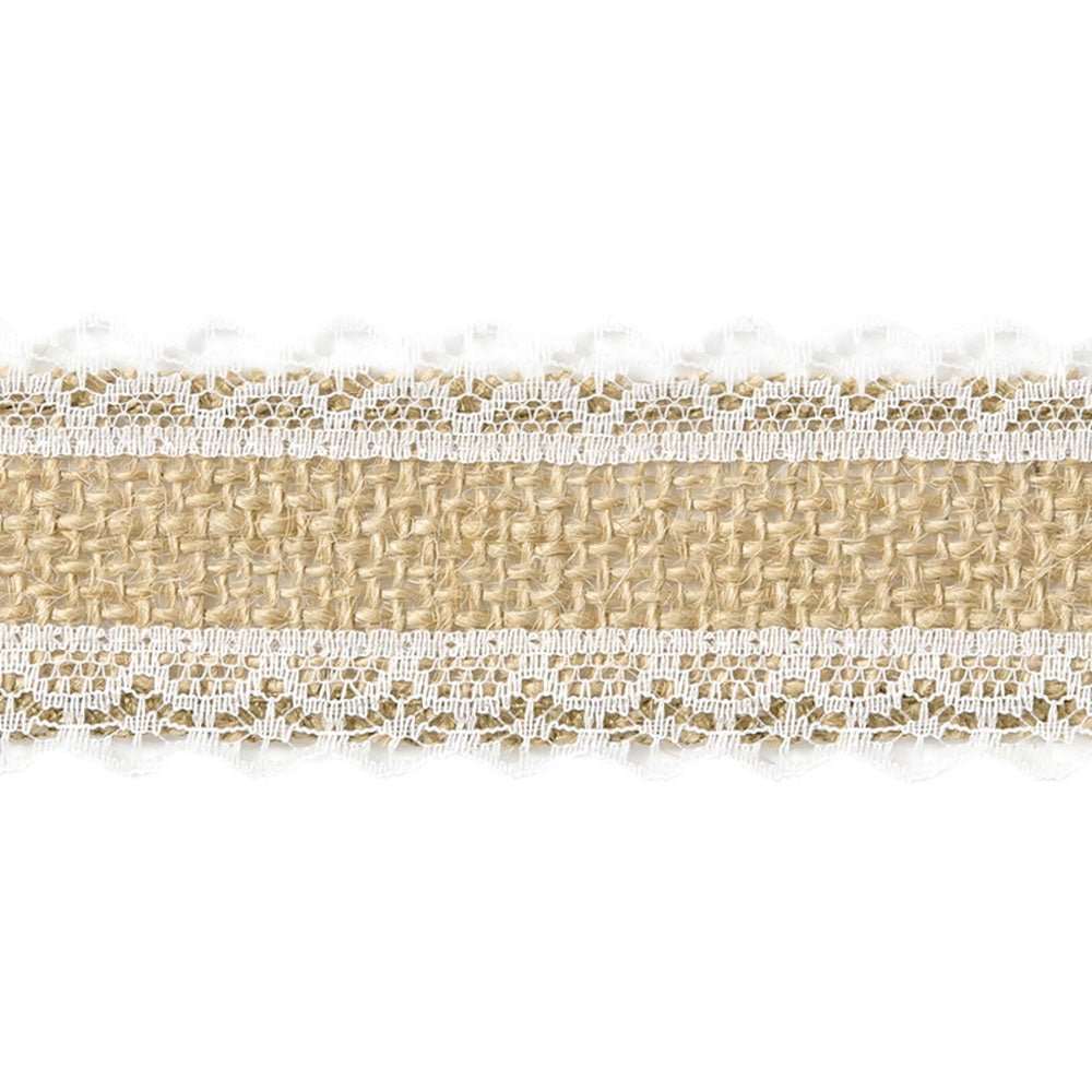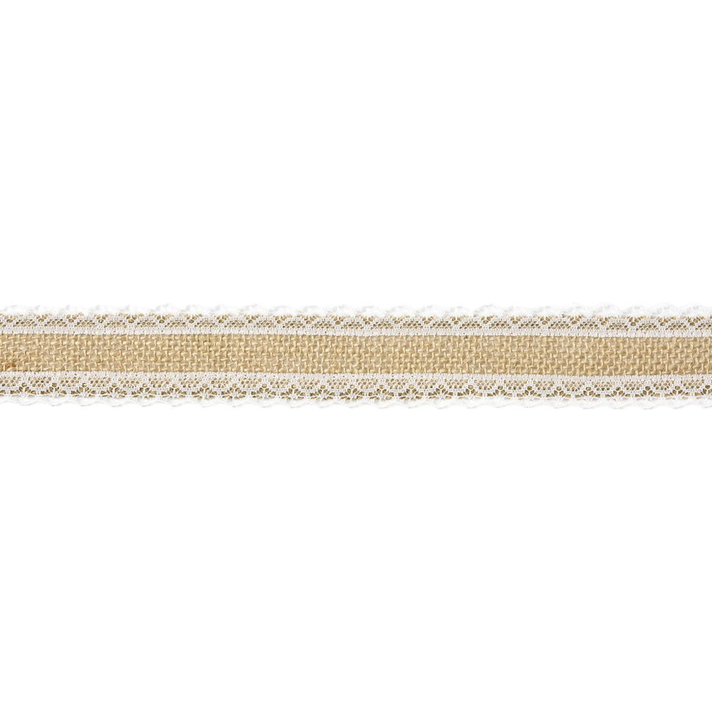 Jute Ribbon with Lace Edges includes a natural-colored decorative ribbon made of jute with white lace edges. The ribbon comes on a convenient roll and is approximately 4 cm wide and 5 meters long.