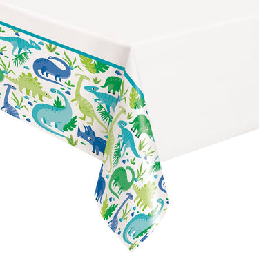 Dinosaur Plastic Tablecloth Green & Blue includes a plastic tablecloth with motifs of various dinosaurs in blue and green on a white background. The plastic tablecloth is approximately 1.37 x 2.13 meters in size.