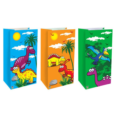 Dinosaur Candy Bags include 12 candy bags with dinosaur designs. The candy bags are made of paper and are approximately 25 cm high, 12.5 cm wide, and 7.5 cm deep. Stickers with dinosaurs in the same color as the bag and a text line are included.