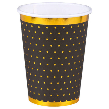 Polka Dot Black and Gold Paper Cups include 10 black disposable cups with decorative gold dots. The cups are made of paper and are approximately 9.5 cm high and 7.5 cm wide.