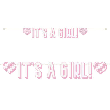 It's a Girl Garland Pink & White includes a paper garland in the shape of the text "It's a girl" in pink and white with striped hearts at both ends. The garland is approximately 1.52 meters long, and the motifs are about 15 cm high and 12.5 cm wide. It is hung up with white and gold string.