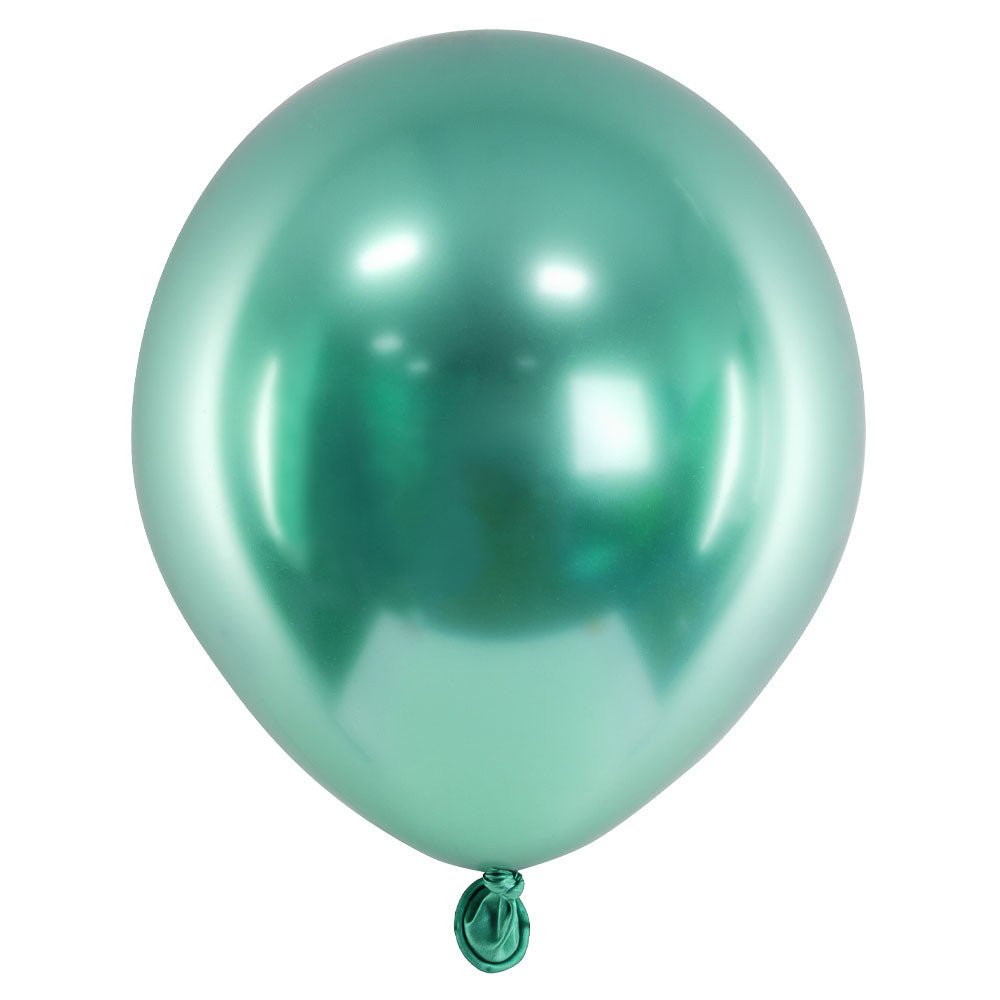Glossy Mini Balloons Green 50-pack includes 50 green latex balloons with a glossy effect. The balloon is approximately 12 cm in diameter and is filled with air.