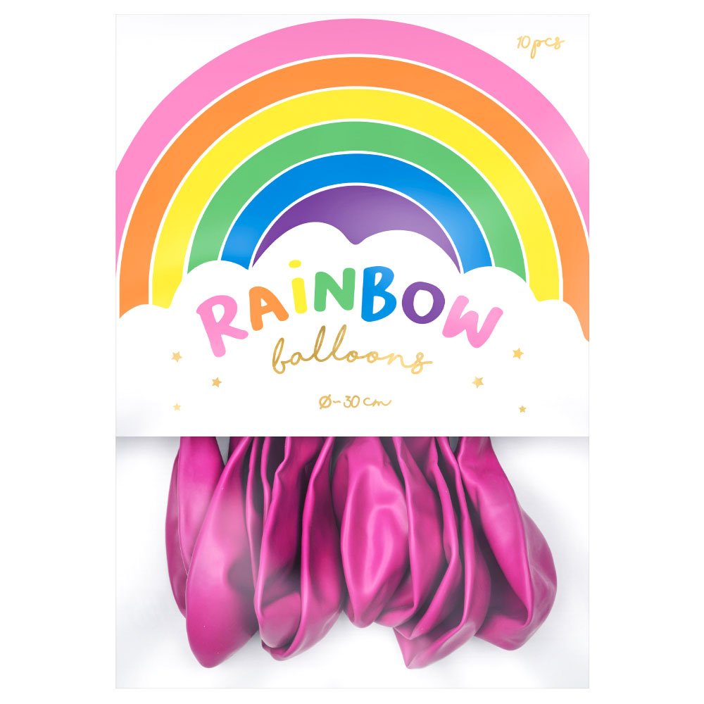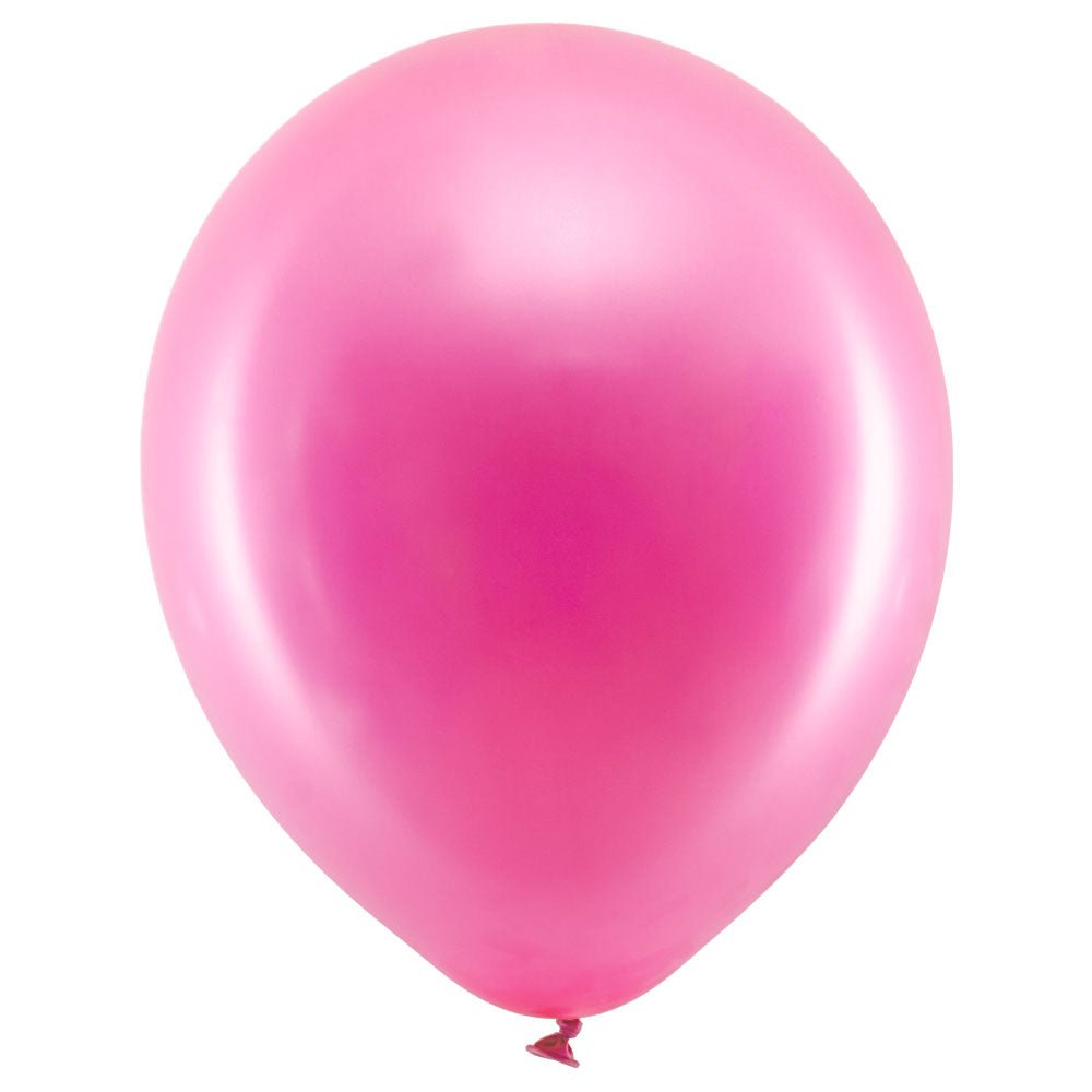 Rainbow Latex Balloons Metallic Fuchsia includes 10 metallic latex balloons in fuchsia pink. The balloons can be filled with air or helium and measure approximately 30 cm in diameter.