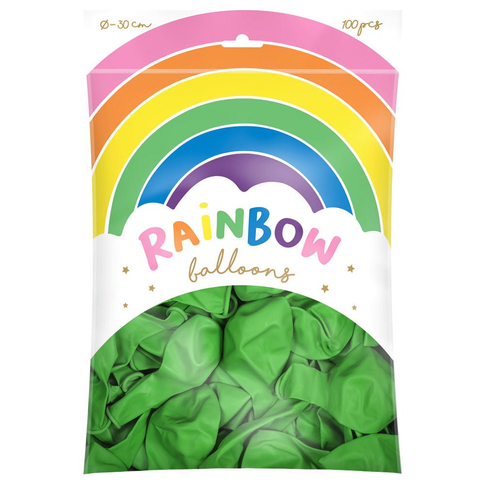 Rainbow Latex Balloons Metallic Light Green 100-pack includes a 100-pack of metallic light green latex balloons that can be filled with air or helium and measure approximately 30 cm in diameter when inflated.