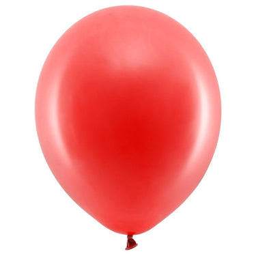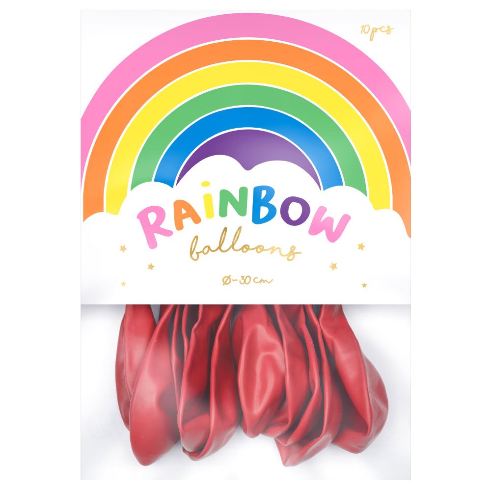 Rainbow Latex Balloons Pastel Red includes 10 pastel red latex balloons measuring approximately 30 cm in diameter. Inflate the balloons with air or helium.