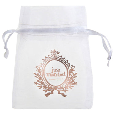 Small Organza Bags Just Married Rose Gold includes a 6-pack of white organza bags with white drawstrings and rose gold "Just Married" text on the front. The bags are made of polyester and are approximately 10 cm high and 7 cm wide.