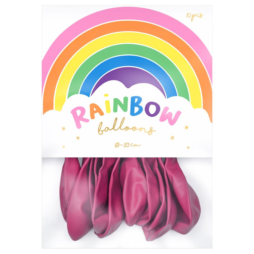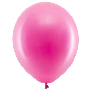 Rainbow Small Latex Balloons Metallic Fuchsia includes 10 metallic latex balloons in fuchsia pink. The balloons measure approximately 23 cm in diameter and can be filled with air or helium.