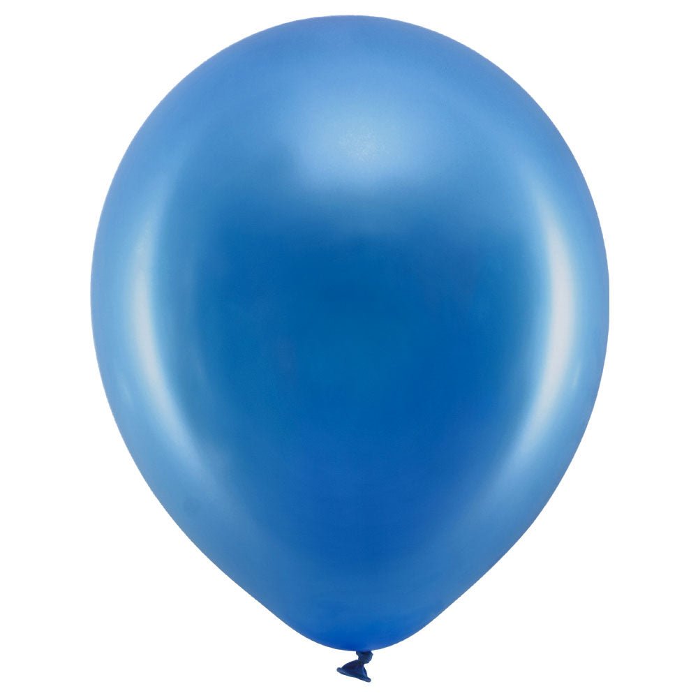 Rainbow Small Latex Balloons Metallic Navy Blue includes 10 metallic navy blue latex balloons that measure approximately 23 cm in diameter. Inflate the balloons with air or helium.